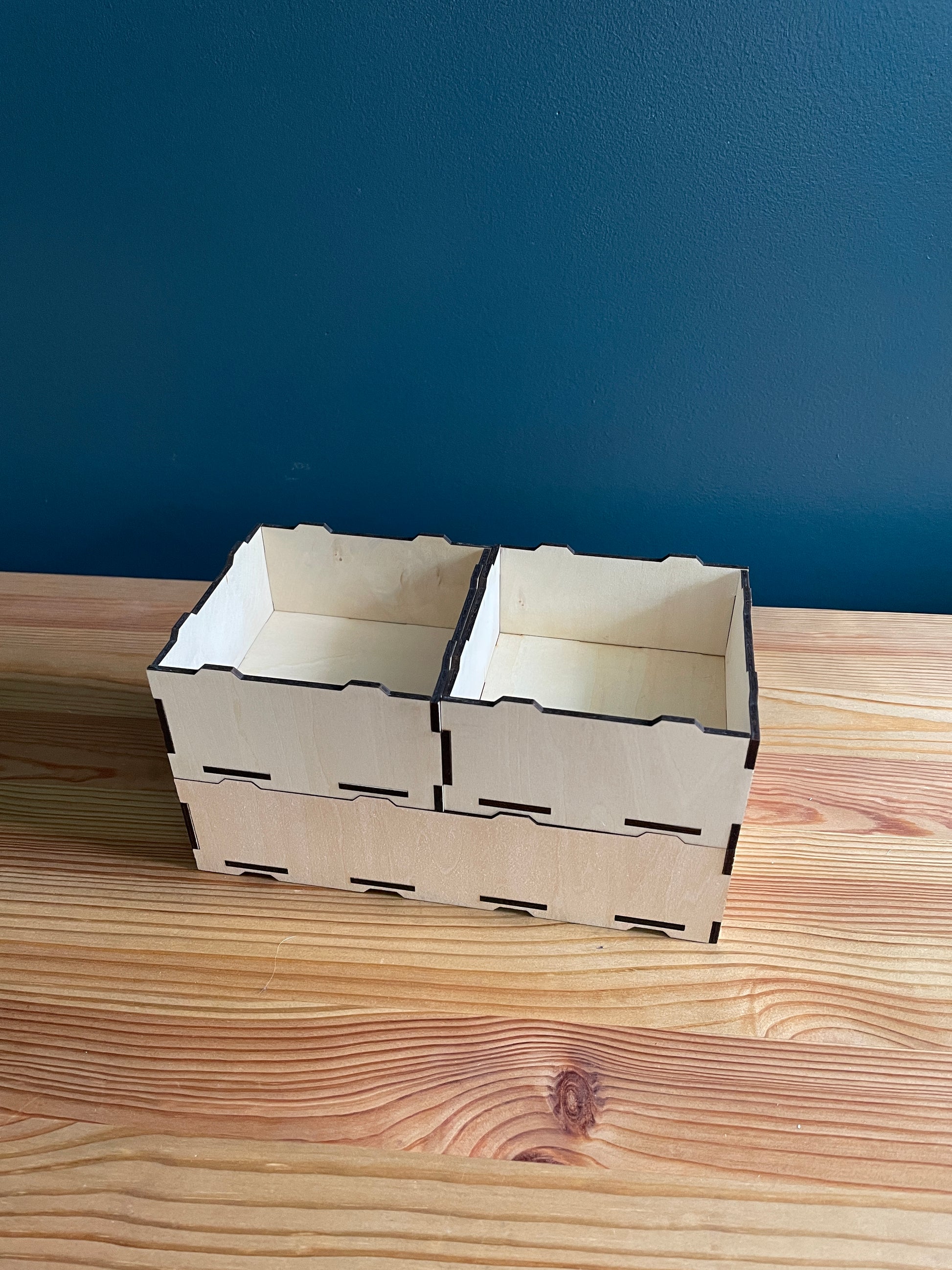 Organisez efficacement votre espace avec la boîte de rangement modulaire Dilubox – hauteur 5 cm. Conçue en bois dans mon atelier, elle s’emboîte parfaitement avec les autres formats de la gamme pour créer un rangement sur mesure.